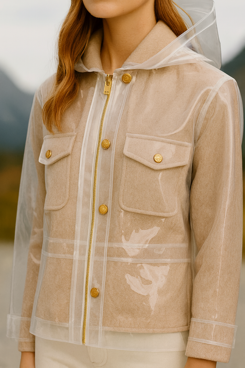 Details: Edle goldene Reißverschlüsse, Knöpfe und Akzente, die der Jacke einen luxuriösen Touch verleihen.